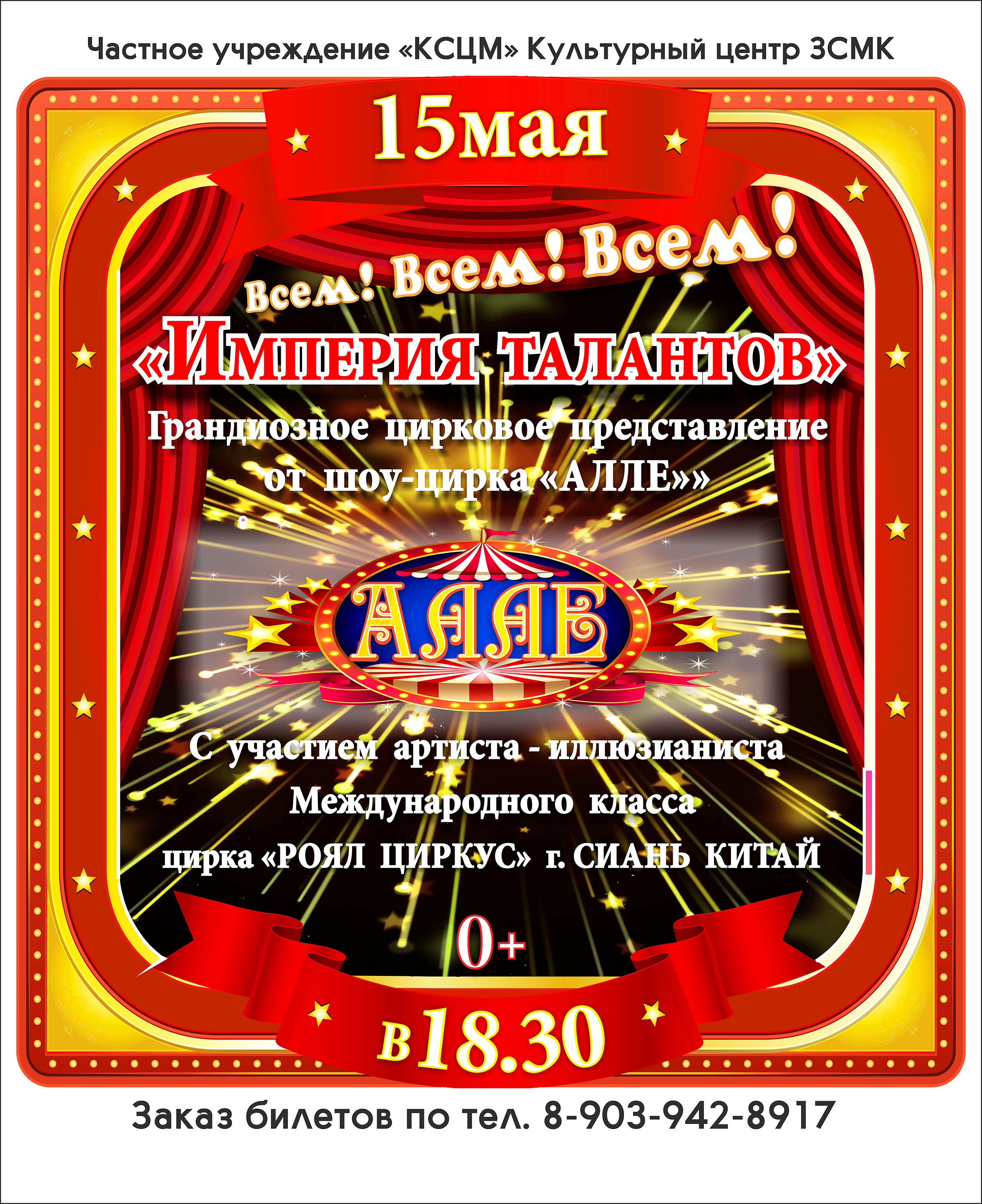 15 мая 2026 года в 18:30 шоу-цирк «АЛЛЕ» совместно с приглашённым гостем – иллюзионистом международного класса приглашают всех желающих на представление «ИМПЕРИЯ ТАЛАНТОВ» в Культурный центр ЗСМК.